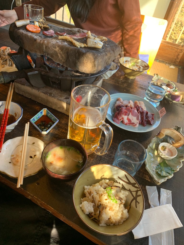 My focus was mainly on the massive rock on the table, with fire licking at its underside. We decided to order the wild boar, venison, and chicken set meal — deciding against any more game or grilled fish. The meal came with an entrée of seasonal vegetables and we had mushrooms and konjac to grill alongside the meat. We were also given miso soup and friend rice as well as a small sorbet for dessert.