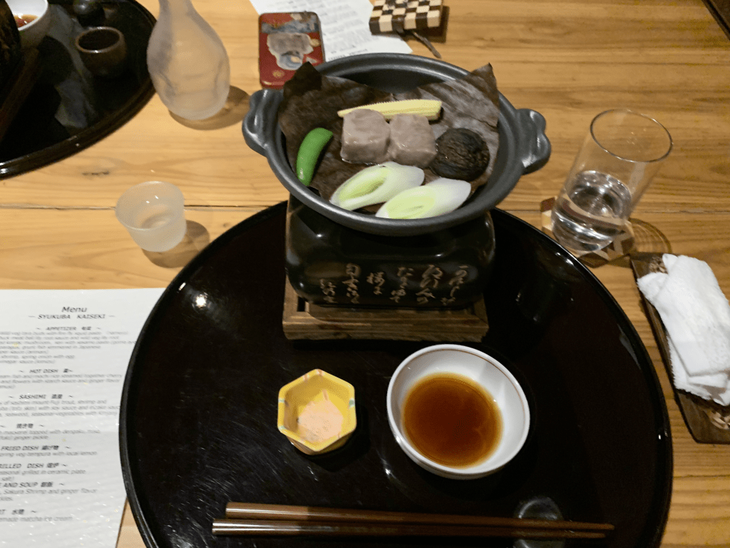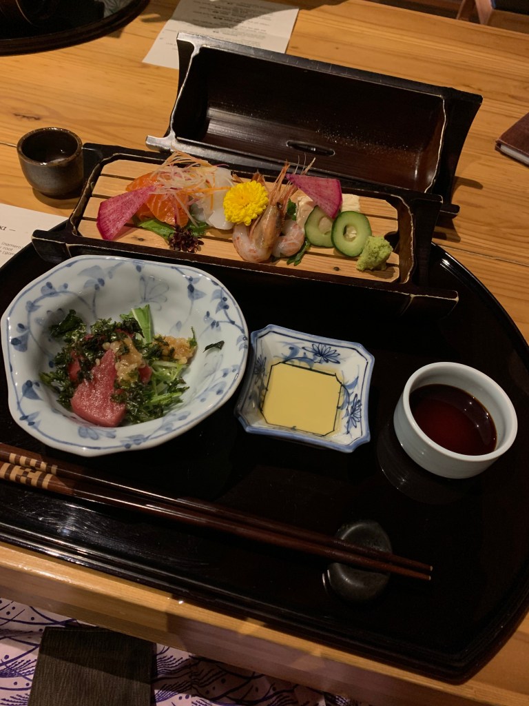 One great part was that they had printed out the kaiseki menu for us and we each had an individual menu to consult in case we forgot after our waiter explained it all to us (which I did). You could also order à la carte, but we stuck to the meal and the alcohol that was included. There were eight courses and it took us around two hours overall to eat everything. We were not rushed at all.